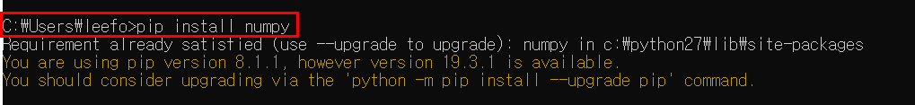 실행된 파이썬 인터프리터에서 나오려면 '컨트롤키+Z키' 를 입력한 후 엔터를 쳐주면 된다. 혹은 'quit()'를 입력해도 된다. 빠져나온 후 pip도 제대로 실행되는지 확인해보자. numpy가 이미 설치되어 있기 때문에 아래와 같이 뜨지만, 어쨌든 오류없이 정상실행된다면 문제없는 것이다. :)