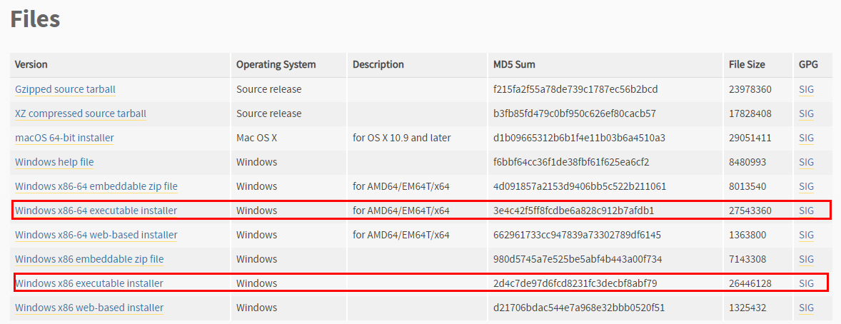 원하는 버전을 선택 후, 다운로드 버튼을 클릭하면 새로운 페이지가 나오고 페이지 맨 하단에 보면 'Files'라는 부분이 있다. 본인의 윈도우가 32bit인지 64bit인지 확인하고 각 bit에 맞는 설치파일을 다운받는다.