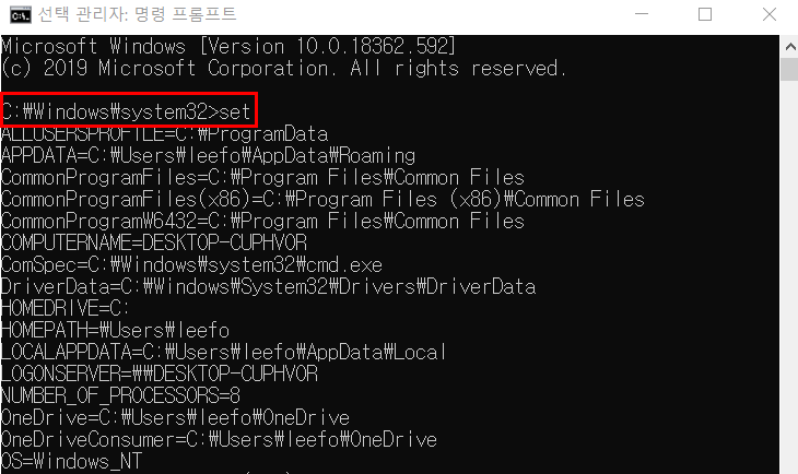 이제 마지막 단계에 왔다. 등록한 시스템 환경 변수를 재부팅 없이 바로 적용시키기 위해 'cmd'를 관리자모드로 실행한 후 'set'을 입력한다.