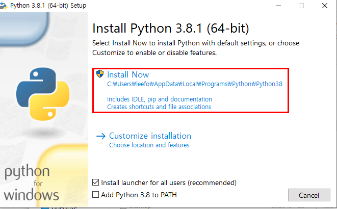 다운로드 받아진 exe파일을 클릭하면 파이썬 설치가 시작된다. 'Install Now' 를 클릭해서 설치해준다.