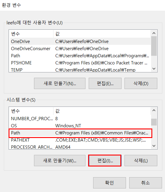 '제어판>시스템 및 보안>시스템>고급 시스템 설정>환경변수'로 들어가면 시스템 변수에 Path 라고있다. Path를 누른 후 편집을 눌러 편집 화면으로 들어간다.