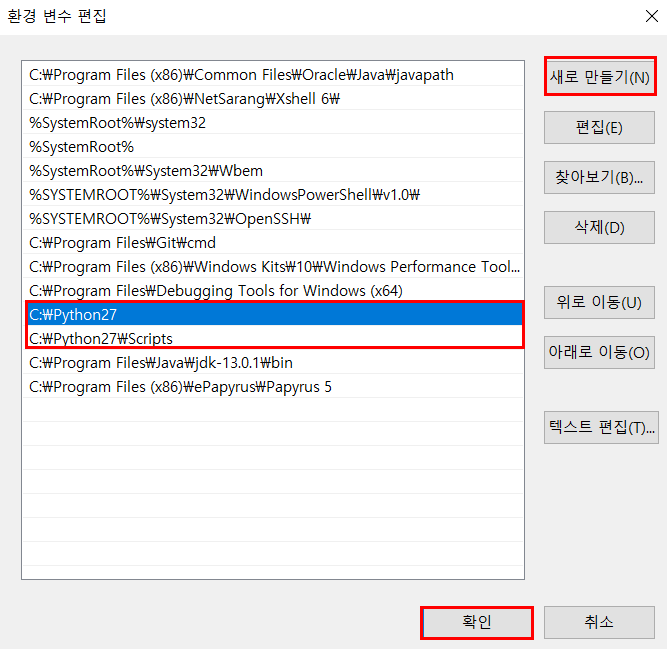 그리고 파이썬이 설치된 경로를 아래와 같이 '새로 만들기'를 눌러서 추가해주면 된다. 추가적으로 '[파이썬 설치 경로]\Scripts'도 추가해준다. Scripts 폴더안에는 파이썬 내장 모듈 설치프로그램인 pip 실행파일이 있다. pip를 사용하면 numpy같은 모듈을 간단한 명령어로 바로 설치할 수 있다.