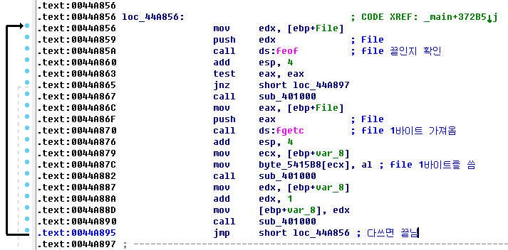 위 코드를 빼면 함수 자체는 별로 크지 않다. 반복문이 계속 나오게 되는데 첫번째 반목문에서는 암호화된 file 데이터를 1바이트씩 가져와서 0x5415B8에 쓴다. 그리고 feof 로 파일 끝인지 확인하고 끝이면 반복문을 탈출한다.