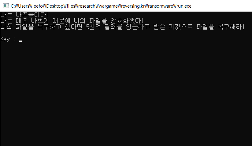 이번문제는 랜섬웨어 문제이다. 설마 뭐 진짜 내파일을 암호화할꺼라고 생각하진 않았지만 혹시 모르기 때문에 그냥 가상환경에서 진행했다. run 파일을 실행시키면 아래와 같이 zip파일에 들어있던 파일 file을 암호화했다고 협박(?) 메시지가 나온다.