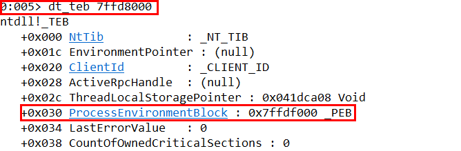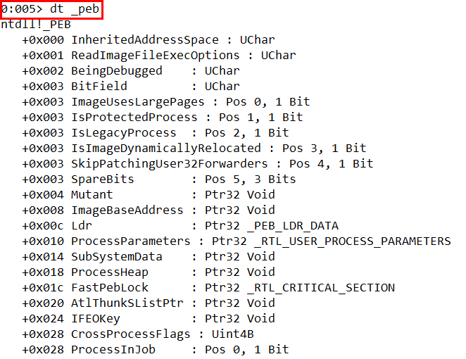 0:005> dt _peb ntdll!_PEB +0x000 InheritedAddressSpace : UChar +0x001 ReadImageFileExecOptions : UChar +0x002 BeingDebugged : UChar // 디버깅당하고 있는지 확인 (IsDebuggerPresent) +0x003 BitField : UChar +0x003 ImageUsesLargePages : Pos 0, 1 Bit +0x003 IsProtectedProcess : Pos 1, 1 Bit +0x003 IsLegacyProcess : Pos 2, 1 Bit +0x003 IsImageDynamicallyRelocated : Pos 3, 1 Bit +0x003 SkipPatchingUser32Forwarders : Pos 4, 1 Bit +0x003 SpareBits : Pos 5, 3 Bits +0x004 Mutant : Ptr32 Void +0x008 ImageBaseAddress : Ptr32 Void // 프로세스의 imagebase +0x00c Ldr : Ptr32 _PEB_LDR_DATA // 프로세스에 로드된 모듈 리스트 +0x010 ProcessParameters : Ptr32 _RTL_USER_PROCESS_PARAMETERS +0x014 SubSystemData : Ptr32 Void +0x018 ProcessHeap : Ptr32 Void // 프로세스의 힙 정보 +0x01c FastPebLock : Ptr32 _RTL_CRITICAL_SECTION +0x020 AtlThunkSListPtr : Ptr32 Void +0x024 IFEOKey : Ptr32 Void +0x028 CrossProcessFlags : Uint4B +0x028 ProcessInJob : Pos 0, 1 Bit +0x028 ProcessInitializing : Pos 1, 1 Bit +0x028 ProcessUsingVEH : Pos 2, 1 Bit +0x028 ProcessUsingVCH : Pos 3, 1 Bit +0x028 ProcessUsingFTH : Pos 4, 1 Bit +0x028 ReservedBits0 : Pos 5, 27 Bits +0x02c KernelCallbackTable : Ptr32 Void +0x02c UserSharedInfoPtr : Ptr32 Void +0x030 SystemReserved : [1] Uint4B +0x034 AtlThunkSListPtr32 : Uint4B +0x038 ApiSetMap : Ptr32 Void +0x03c TlsExpansionCounter : Uint4B +0x040 TlsBitmap : Ptr32 Void +0x044 TlsBitmapBits : [2] Uint4B +0x04c ReadOnlySharedMemoryBase : Ptr32 Void +0x050 HotpatchInformation : Ptr32 Void +0x054 ReadOnlyStaticServerData : Ptr32 Ptr32 Void +0x058 AnsiCodePageData : Ptr32 Void +0x05c OemCodePageData : Ptr32 Void +0x060 UnicodeCaseTableData : Ptr32 Void +0x064 NumberOfProcessors : Uint4B +0x068 NtGlobalFlag : Uint4B +0x070 CriticalSectionTimeout : _LARGE_INTEGER +0x078 HeapSegmentReserve : Uint4B +0x07c HeapSegmentCommit : Uint4B +0x080 HeapDeCommitTotalFreeThreshold : Uint4B +0x084 HeapDeCommitFreeBlockThreshold : Uint4B +0x088 NumberOfHeaps : Uint4B +0x08c MaximumNumberOfHeaps : Uint4B +0x090 ProcessHeaps : Ptr32 Ptr32 Void +0x094 GdiSharedHandleTable : Ptr32 Void +0x098 ProcessStarterHelper : Ptr32 Void +0x09c GdiDCAttributeList : Uint4B +0x0a0 LoaderLock : Ptr32 _RTL_CRITICAL_SECTION +0x0a4 OSMajorVersion : Uint4B +0x0a8 OSMinorVersion : Uint4B +0x0ac OSBuildNumber : Uint2B +0x0ae OSCSDVersion : Uint2B +0x0b0 OSPlatformId : Uint4B +0x0b4 ImageSubsystem : Uint4B +0x0b8 ImageSubsystemMajorVersion : Uint4B +0x0bc ImageSubsystemMinorVersion : Uint4B +0x0c0 ActiveProcessAffinityMask : Uint4B +0x0c4 GdiHandleBuffer : [34] Uint4B +0x14c PostProcessInitRoutine : Ptr32 void +0x150 TlsExpansionBitmap : Ptr32 Void +0x154 TlsExpansionBitmapBits : [32] Uint4B +0x1d4 SessionId : Uint4B +0x1d8 AppCompatFlags : _ULARGE_INTEGER +0x1e0 AppCompatFlagsUser : _ULARGE_INTEGER +0x1e8 pShimData : Ptr32 Void +0x1ec AppCompatInfo : Ptr32 Void +0x1f0 CSDVersion : _UNICODE_STRING +0x1f8 ActivationContextData : Ptr32 _ACTIVATION_CONTEXT_DATA +0x1fc ProcessAssemblyStorageMap : Ptr32 _ASSEMBLY_STORAGE_MAP +0x200 SystemDefaultActivationContextData : Ptr32 _ACTIVATION_CONTEXT_DATA +0x204 SystemAssemblyStorageMap : Ptr32 _ASSEMBLY_STORAGE_MAP +0x208 MinimumStackCommit : Uint4B +0x20c FlsCallback : Ptr32 _FLS_CALLBACK_INFO +0x210 FlsListHead : _LIST_ENTRY +0x218 FlsBitmap : Ptr32 Void +0x21c FlsBitmapBits : [4] Uint4B +0x22c FlsHighIndex : Uint4B +0x230 WerRegistrationData : Ptr32 Void +0x234 WerShipAssertPtr : Ptr32 Void +0x238 pContextData : Ptr32 Void +0x23c pImageHeaderHash : Ptr32 Void +0x240 TracingFlags : Uint4B +0x240 HeapTracingEnabled : Pos 0, 1 Bit +0x240 CritSecTracingEnabled : Pos 1, 1 Bit +0x240 SpareTracingBits : Pos 2, 30 Bits