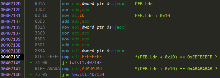 peb의 Ldr은(peb+0xc)는 _PEB_LDR_DATA 구조체를 가리키는데 Ldr을 사용한 안티디버깅 방법은 디버깅 중인 프로세스의 사용되지 않는 힙은 0xEEFEEEFE 혹은 0xABABABAB로 채워지는 특성을 이용한 방법이다. _PEB_LDR_DATA 구조체는 힙메모리 안에 있기 때문에 Ldr주소에서부터 메모리를 검사하면 디버깅 여부를 탐지할 수 있게된다.