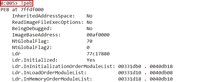 windbg에서 PEB 구조체 시작 주소 확인은 !peb에서 확인할 수 있다.