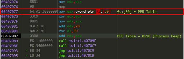 아래 어셈을 보면, fs:[30]으로 peb 주소를 구하고 원하는 peb 정보를 얻고 있다. 참고로 fs:[0]은 TEB 구조체의 시작 주소를 담고있다.