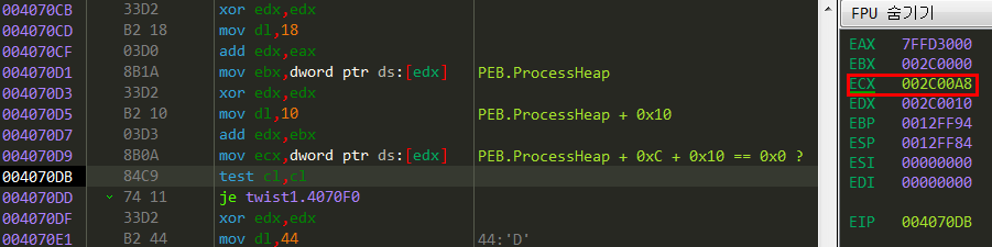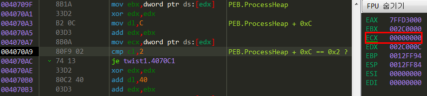 peb의 ProcessHeap은(peb+0x18) HEAP 구조체의 시작 주소를 갖고 있고 PEB.ProcessHeap+0xC는 Flags를 +0x10은 ForceFlags 값을 갖고있다. 이 Flag 값을 사용하면 디버깅 중인지 여부를 판단할 수 있게된다. PEB.ProcessHeap + 0xC 값은 0x2일 경우 정상이고 0x0인 경우 디버깅 중인 상태로 판단한다.