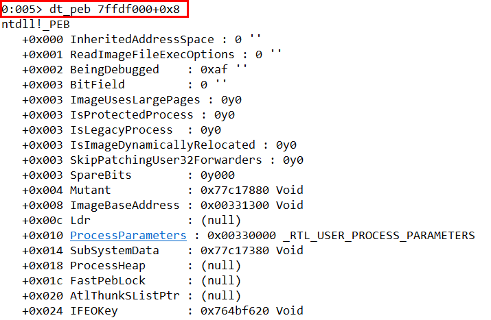참고로, 구조체를 실제 값과 같이 보려면 dt 뒤에 위에서 확인한 peb 주소를 같이 넘겨주면 된다.