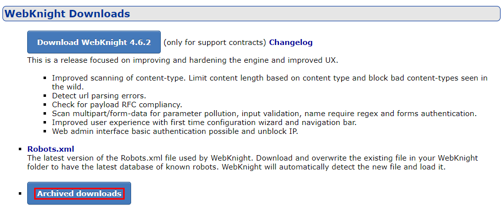 IIS 서버 앞단에 위치해 웹서버로 들어오는 모든 웹 요청을 검사하는 윈도우 기반 공개용 웹방화벽이다. SQL 인젝션 공격 등 특정 웹 공격도 바로 차단한다. 무료 버전을 사용하려면 다운로드 페이지 하단에 'Archived Downloads'를 클릭하면 된다.