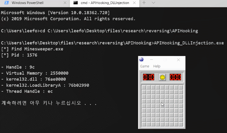 저번 포스팅에서 CreateRemoteThread를 통해 지뢰찾기.exe에 메시지창을 띄우는 스레드를 실행시키는 DLL을 인젝션해보았다. 이번에는 DLL에 메시지창을 띄우는 스레드를 실행시키는 코드 대신에 특정 코드를 후킹..