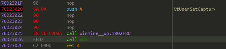 타겟 API는 win32u.dll의 NtUserSetCapture()로 정했는데, 클릭시 호출되는 클릭 이벤트핸들러를 트레이싱하다보면 마우스의 움직임을 감지하는 SetCapture함수를 호출(내부에서 NtUserSetCapture 호출)하는 것을 볼 수 있다. 이 win32u.dll의 NtUserSetCaptureAPI를 후킹해서 클릭 이벤트가 발생하면 게임 종료 직전에 모든 지뢰를 보여주는 함수 sub_1002F80가 실행되도록 해볼것이다.