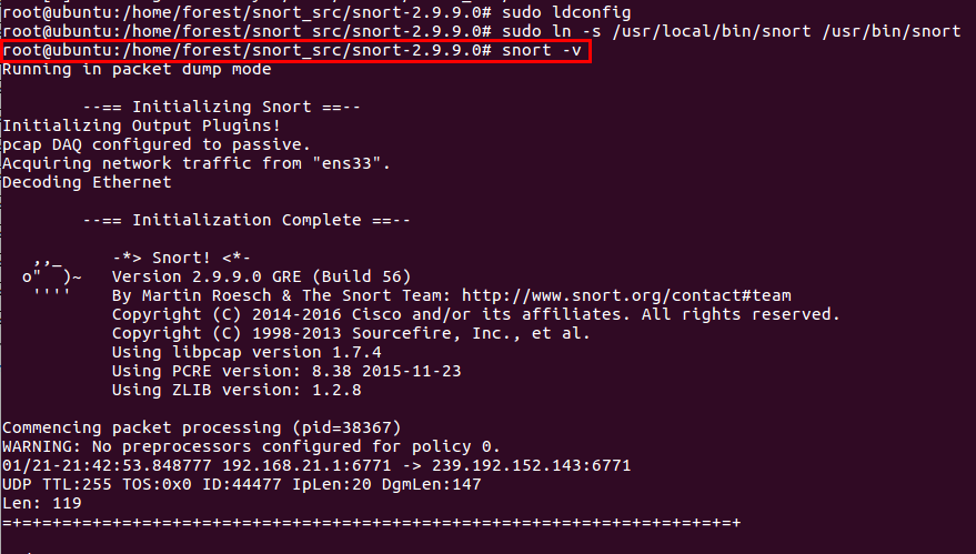 sudo ln -s /usr/local/bin/snort /usr/sbin/snort