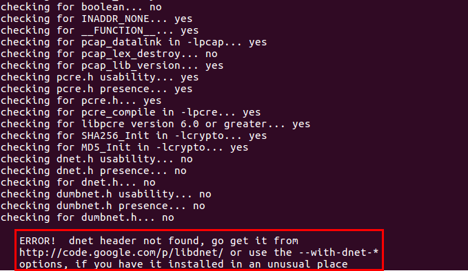 tar 파일 압축을 풀고 아래와 같이 configure (환경설정)을 하려는데 이번엔 'dnet header not found' 에러가 났다.