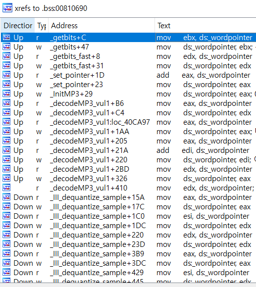 | _decodeMP3_vul1 | 40CDBC | mov edx, ds:_wordpointer | @[wordpointer] = 0fc32d04 | |