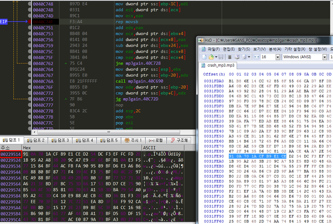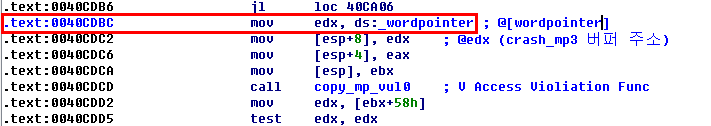 즉 crash_mp3.mp3 파일 내의 31FE90의 4바이트를 원하는 주소가 되는 값의 주소로 변경하면 [229514]값을 조정할 수 있고 결국 _wordpointer에 원하는 값을 넣을 수 있고,이 wordpointer는 0040CDBC의 edx로 들어가고 edx는 다시 [esp+8]로 (copy_mp_vul0)의 세번째 인자로 들어가고 그 세번째 인자가 다시 0040C743의 edi로 들어가고 esi 버퍼를 edi 버퍼로 복사하는 과정에서 edi를 읽을 수 없기 때문에 access violation이 발생한다.