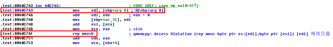 크래쉬는 0040C710의 함수 copy_mp_vul0 의 qmemcpy에서 발생한다. [esi]를 [edi]에 복사하려다가 edi 값을 읽을 수 없어 Access Violation이 발생한 것이다. 그럼 여기서 edi 값이 문제라는 것은 결국 [ebp+arg_8] 즉 해당 함수로 넘어온 인자값이 문제라는 것을 알 수 있다.