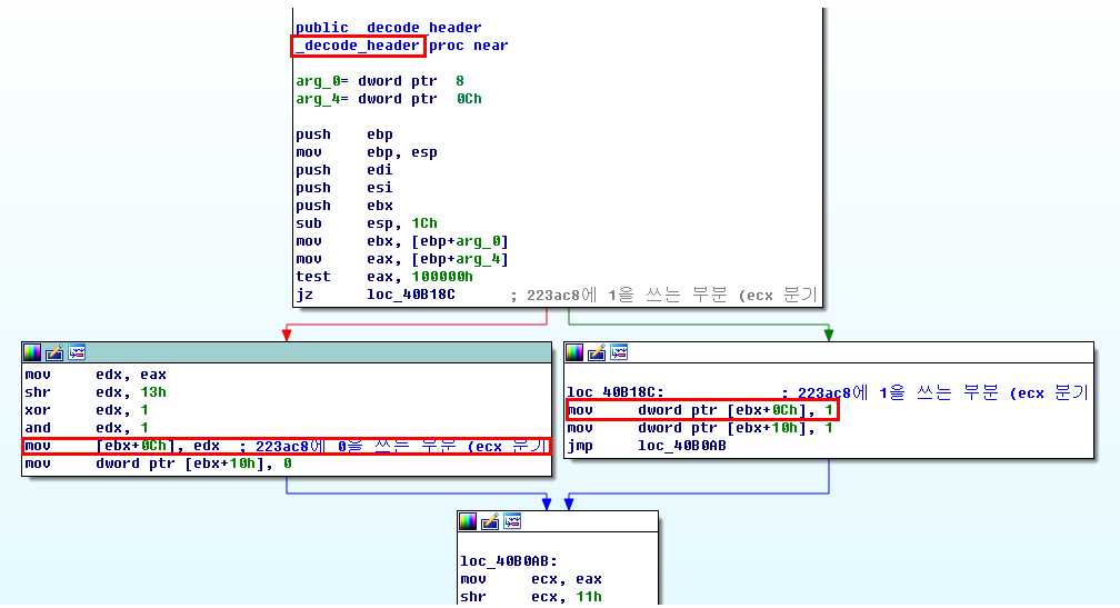 아래부분에서 파일에서 가져온 부분이 0이고 eax가 0이되고 esi가 FFFB9900이고 두개 or한게 FFFB9900인데 FFFB9900 & 100000 -> 1이기 때문에 분기가 11, 20 그쪽으로 타게된다.