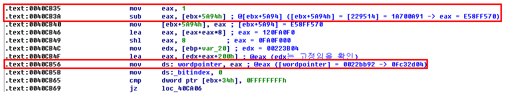 40cb5b 이전 코드 주소는 0040CB56이고 0040CB56여기서 마지막으로 [wordpointer]가 fc32d04가 된다. lea eax, [edx+eax+200]에서 @edx인지 @eax인지 @edx&@eax 인지 헷갈리지만 동적 확인 결과 edx는 고정적으로 223B04임을 확인했다. 따라서 @eax 이다. 마지막으로 eax는 1-[ebx+5A94] 임이 확인된다. (참고로 @edx는 edx가 문제인지 라는 뜻의 축약으로 사용했다)