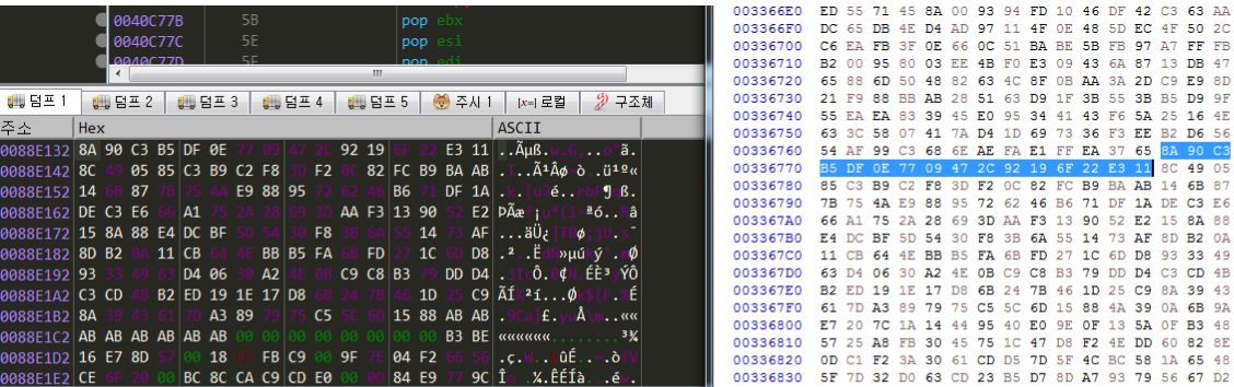 따라서 [229514]가 1a700a91이 되는 코드인 0040C74F를 확인해 본다. x64Dbg에서 40c74f에 [229514] == 1a700a91 를 조건으로 bp를 건후 실행상황을 보면 esi 버퍼값을 edi 버퍼로 복사하는데 [229514]가 이과정에서 덮히게 되고 덮히게 된 hex값을 확인해 보면 실제로 파일 내에 있는 hex값들이다.