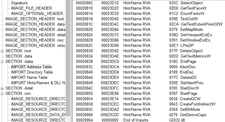 IAT는 이름을 보면 알 수 있지만 프로그램에서 임포트하는 DLL에서 어떤 함수들을 사용하고 있는지 함수명, 시작 주소 등에 대한 정보를 기록해놓은 테이블, 구조체 배열이다. 아래 notepad.exe의 경우 GDI32.dll에서 사용하고 있는 함수 주소 배열이 파일 오프셋 2080C에서부터 시작하고있다.