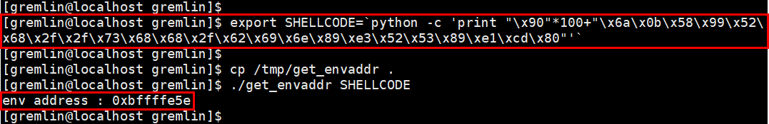 환경변수에 쉘코드와 nop을 100정도 주어 저장한 다음, 환경변수 주소를 알아낸다.