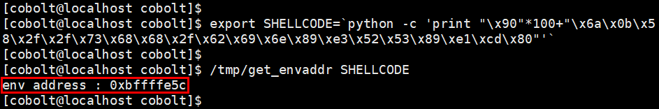 먼저 앞단에 nop이 100정도 들어가있는 쉘코드를 환경변수에 올려준 후 주소값을 구해준다.