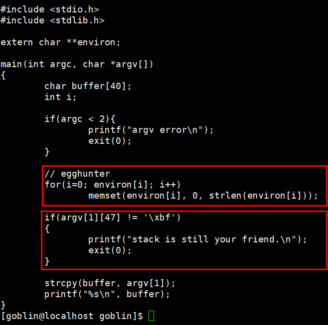 strcpy 취약점을 이용해 bof를 하는 문제인데 앞에 2개정도 고려할 요소가 생겼다. 첫번째는 egghunter로 환경변수를 전부 초기화하고 있기 때문에 환경변수를 사용하지 않고 문제를 풀어야 한다는 것이고 두번째는 argv의 48번째 값이 \xbf여야 한다는 것이다.