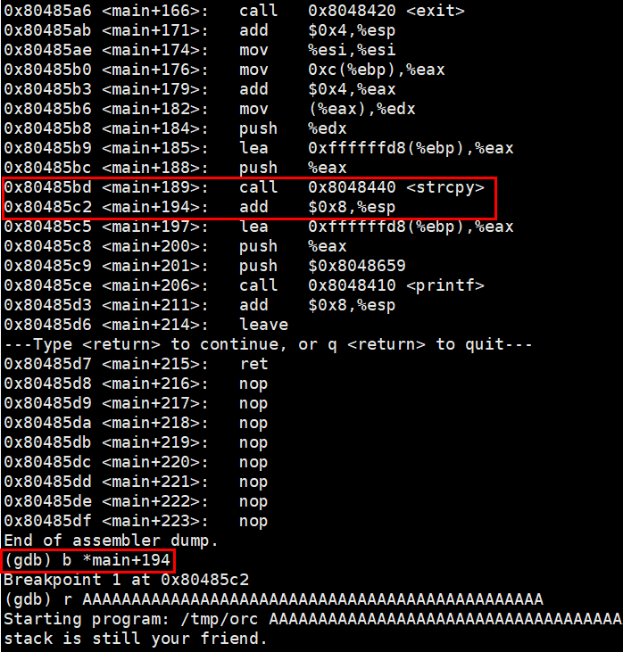 환경변수를 사용하지 못하기 때문에 gdb상에서 입력값이 저장되는 버퍼 주소값을 알아낼 필요가 있다. strcpy 바로 뒤인 main+194에 bp를 건다.
