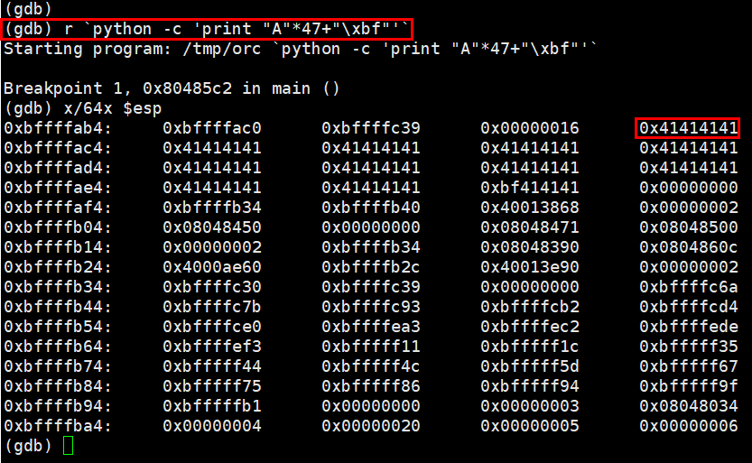 그리고 48번째 바이트가 \xbf가 아니면 프로그램이 조건문에서 종료되기 때문에 조건을 맞춘 인자값을 넘겨주고 실행시킨다. 대략 \xbffffab4 에서부터 입력값이 저장되고 있는데 당연하게도 랜덤스택일 것이다.