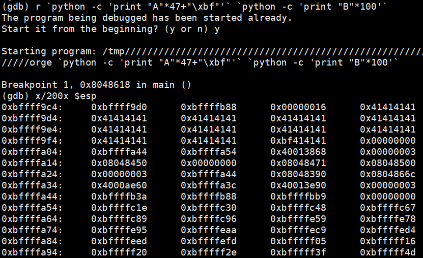 strcpy 호출 뒤에 bp를 건 후 argv[2]에 B를 100개 넘겨주었다.