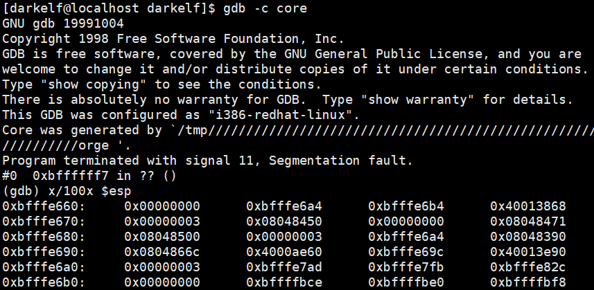 바로 쉘이 따지진 않았고 코어덤프가 생겼다. gdb로 코어파일을 확인해보면 내가 RET에 넘겨준 주소값과 실제 nop과 좀 차이가 많이났다.