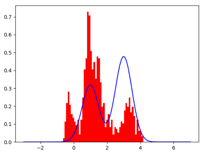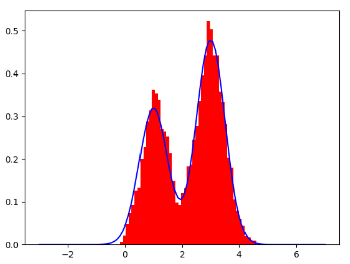 제안 분포(proposal distribution)인 q를 하나 정하는데 보통 샘플링하기 쉬운 가우시안 분포를 사용한다. 아래는 N을 각각 100, 1000, 10000로 설정했을 때, 제안분포가 얼마나 목표분포에 근사하는지를 나타낸 결과이다. N값이 커질수록 목표분포에 근접하는 것을 볼 수 있다.