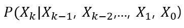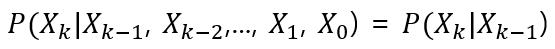 여기서 k=시간, Xk=상태값(k=시간) 이다. 그리고 위 마코프 체인 설명에서 각 상태는 바로 이전의 상태에'만' 영향을 받는다고 가정했기 때문에 아래와 같이 수식을 고칠 수 있다.