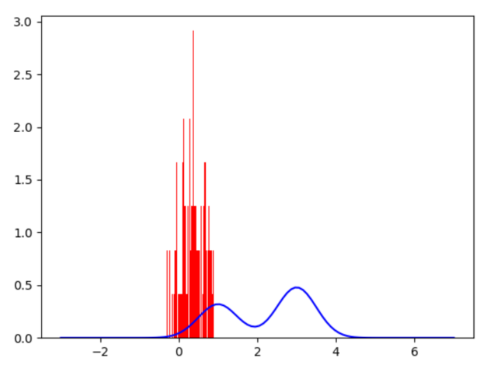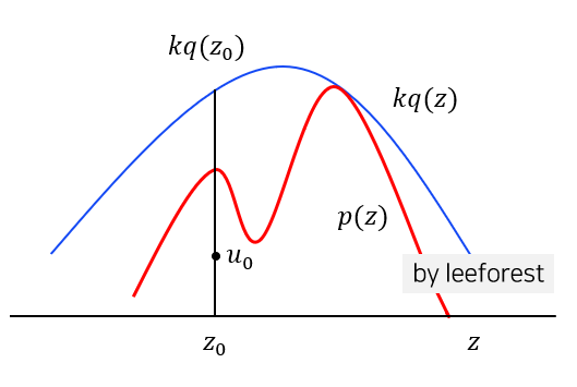 이제 위 그림을 통해 샘플링을 수행하는 방식을 알아보자. 가장 먼저 z0을 선택해야 하는데 이 때 선택된 샘플 z0은 q(z)를 따르는 샘플이고 따지자면 p(z)와는 상관이 없다. 다음으로 균등 분포를 이용하여 [0,kq(z0)] 사이의 난수 하나를 발생시키고 이 값을 u0으로 둔다. 마지막으로 z0을 사용하여 ~p(z)를 구하는데 이 때 만약 u0<=~p(z)이면 샘플을 accept하고 아니면 reject하고 처음부터 샘플을 다시 생성하도록 한다.
