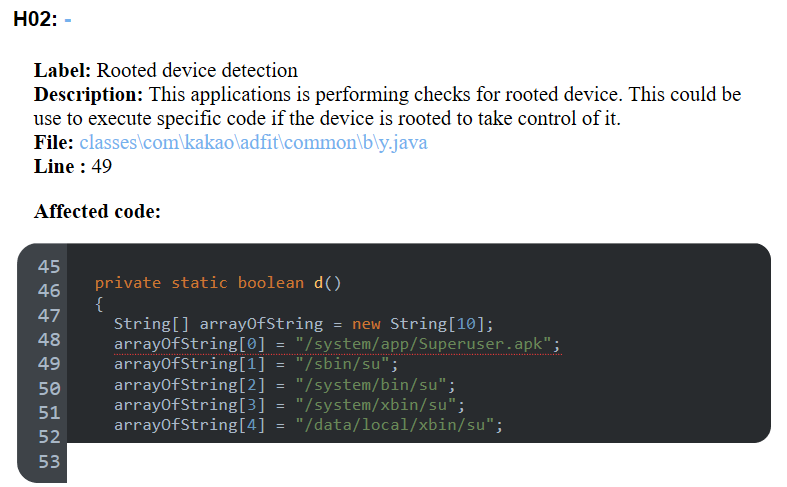 예로 몇개만 살펴보면 다음과 같다. 아무래도 툴이다보니 100% 의지하기에는 무리가 있지만 '이런 부분이 있으니 취약한지 한번 분석해보는게 좋을 것 같다' 의 느낌으로 쓰면 유용할 것 같다. 예를 들어 디바이스가 루팅됐는지 탐지하기 위한건지 아닌지 어쨌든 관련 문자열을 배열에 저장하고 있는 것 자체로는 취약점은 아니고, 이후부터는 수동으로 확인하는 작업이 필요해보인다.