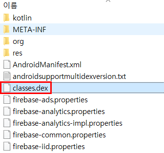 apk 개발을 위해 작성한 java 코드를 컴파일한 후 생긴 클래스 파일을 dx 툴로 변환하면 dex 파일이 생성된다. 그리고 dx 툴로 변환하는 과정에서 java의 바이트 코드가 달빅 바이트 코드로 변환된다. apk 파일 내부를 보면 아래와 같이 classes.dex 파일을 확인할 수 있다.