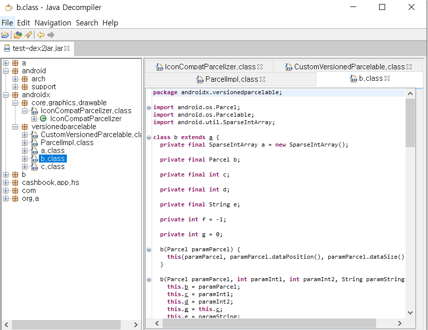 그럼 jex2jar 폴더 내부에 jar 파일이 생성되고 JD-GUI로 열면 아래와 같이 자바코드를 확인할 수 있다.