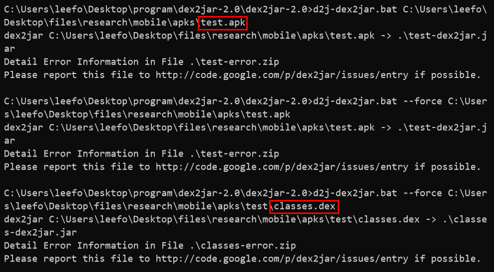 dex2jar를 사용하기 위해선 인자값에 apk 파일이나 dex 파일만 넘겨주면 된다.