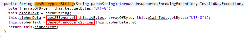 aesEncryptedString 함수를 살펴보면, 내부적으로 aes256 암호화를 수행한다음, base64로 다시 암호화하고 있다.