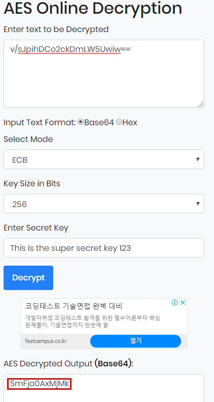 알맞게 값을 넣어준 후 복호화를 수행해보면, base64로 암호화된 결과값이 나온다.