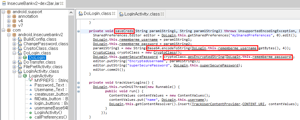 사용자가 로그인 시 입력한 계정을 서버에서 받으면 암호화를 수행할 것이기 때문에 로그인 관련 함수들을 살펴보다 보면 DoLogin.class의 saveCreds 함수를 볼 수 있다. 그리고 saveCreds 함수를 살펴보면, 유저네임은 base64 암호화를 하고, 패스워드는 aesEncryptedString 함수를 사용해 암호화 한다는 것을 알 수 있다.