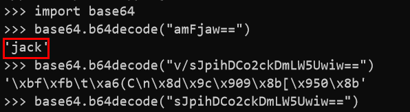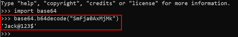 그리고 해당값을 다시 base64로 디코딩해보면 Jack@123$ 패스워드를 얻을 수 있다.