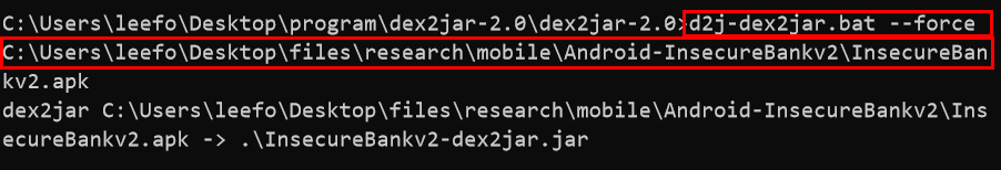 소스를 살펴보기 위해, dex2jar를 사용해 InsecureBankv2.apk 디컴파일을 해준다. 아직 apktool을 사용해서 smali 언어로 디컴파일 하는것이 더 좋은건지 어떤건지 잘 감이안오기 때문에 일단 dex2jar를 사용했다.