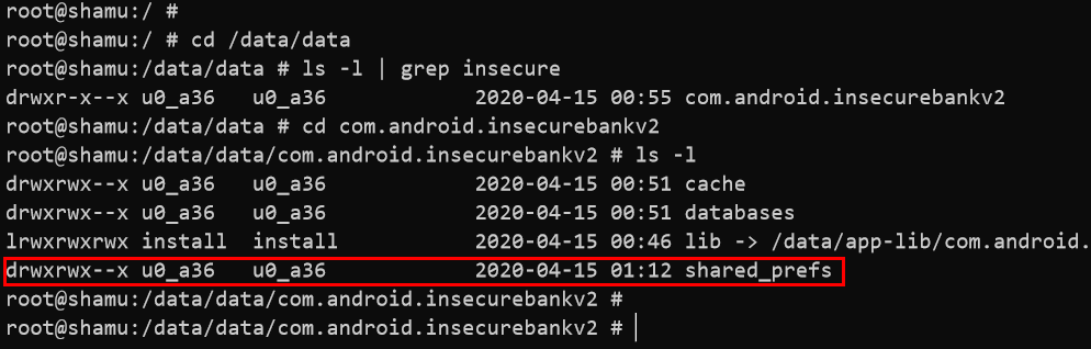 drwxr-x--x u0_a36 u0_a36 2020-04-15 00:55 com.android.insecurebankv2