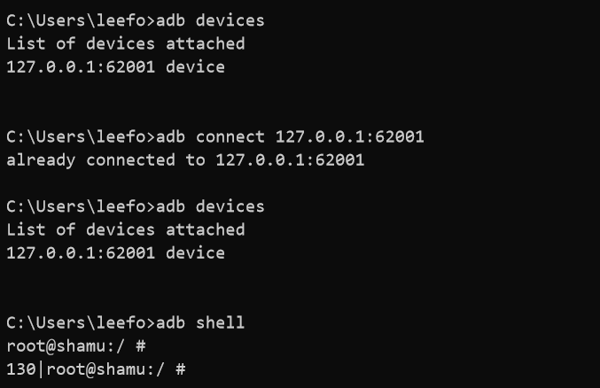 C:\Users\leefo>adb connect 127.0.0.1:62001